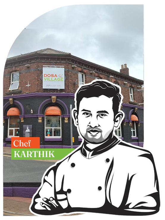 The Flavors of South India and Sri Lanka are Proudly Brought to you by Celebrity Chef Karthik. His Mastery Of Authentic Flavor Has Been the Driving Force Behind Dosa Village’s Success. Starting With the Opening of the First Restaurant in Coventry – 2013, His Vibrant yet Traditional Dishes Quickly Gained a Loyal Following, Leading to the Opening of a Second Location in Shirley – 2015, and a Third in Rugby – 2017. After Launching the Fourth Branch of Dose Village in Stockport – 2024, Wakefield – 2024 and Dosavillage Prescot – 2025 Chef Karthik Continues to Shape Dosa Village into a Place Where People Can Get the Food that they Deserve, Offering Dinners an Exquisite Experience through his Expertise and Unmatched Hospitality. His Mastery of Dishes From South India and Sri Lanka Makes Each and Every One of his Dishes A Masterpiece. Dosa Village Provides the Opportunity to Savour the Cultural Richness of South India and Sri Lanka with Dishes Meticulously Crafted By him that Exhibit the Essence of South Asian Cuisine.
